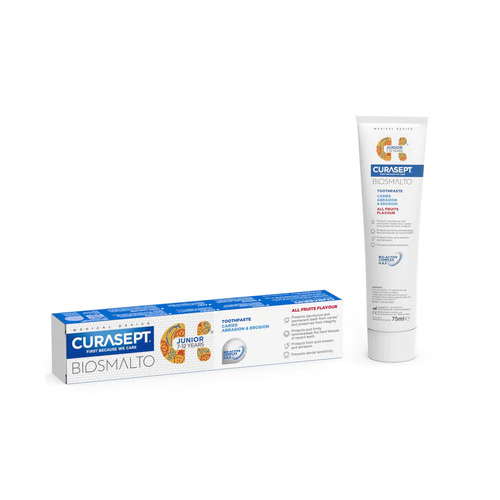 Curasept Biosmalto Toothpaste for juniors aged from 7 - 12 years Curasept Biosmalto Toothpaste especially for Juniors aged 7 - 12 years. Contains 1450ppm fluoride. It protects deciduous and permanent teeth from Caries and preserves their integrity. It also protects and firmly remineralises the hard tissues of recent teeth and protects against acid erosion and abrasion. And also prevents dental sensitivity. 75ml tube Pleasant AllFruits flavour If the kids struggle to eat ice cream, try Biosmalto toothpaste. They will never look back.