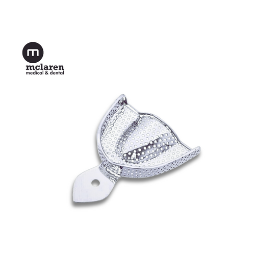 Perforated Stainless Steel Impression Tray Upper Extra Small These impression trays are great quality solid metal pieces, made in England. Rim lock edge ensures impression will easily stick impression These impression trays are made of the highest -grade stainless steel with rounded edges. Suitable for thermal disinfection, autoclaving and ultrasonic cleaning for years or use. Price is for 1 x S/S impression tray.